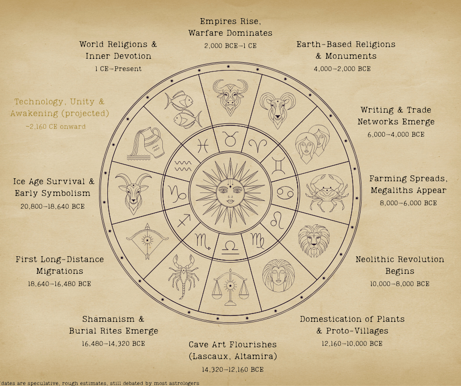 Astrological ages happen because of a slow astronomical phenomenon called the precession of the equinoxes.