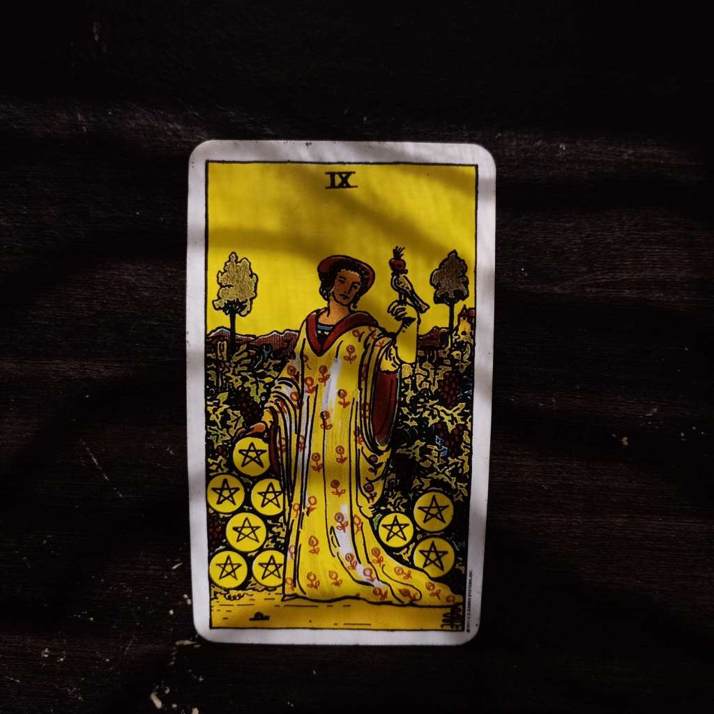 The Nine of Pentacles is the depiction of luxury and success: A woman taking a stroll through her vineyard in her glamour, surrounded by nine gold coins. A bird is perched on her finger, suggesting that her success has brought her peace and control over her environment. As is the nature of her numerology, her journey is not necessarily over yet – but she rejoices and indulges in life’s joys anyway.