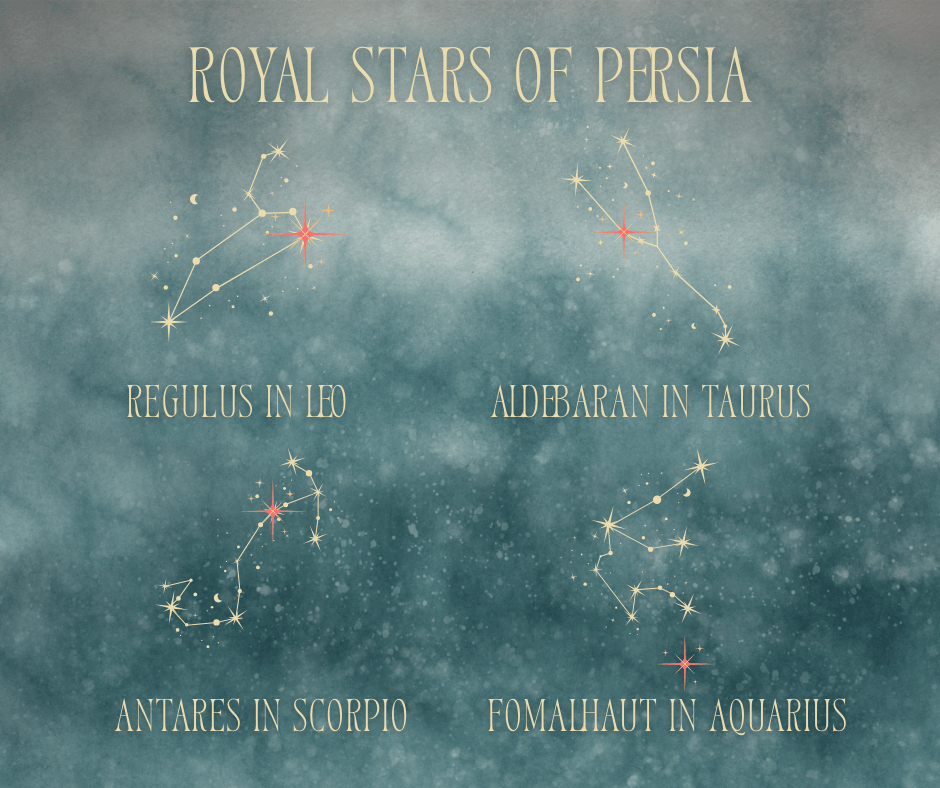 Among the most prominent are the Persian Royal Stars—Regulus in Leo, Aldebaran in Taurus, Antares in Scorpio, and Fomalhaut in Aquarius.